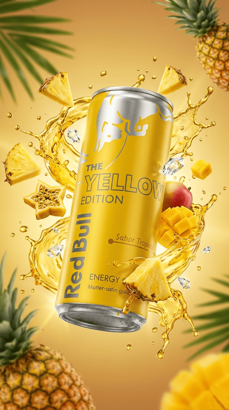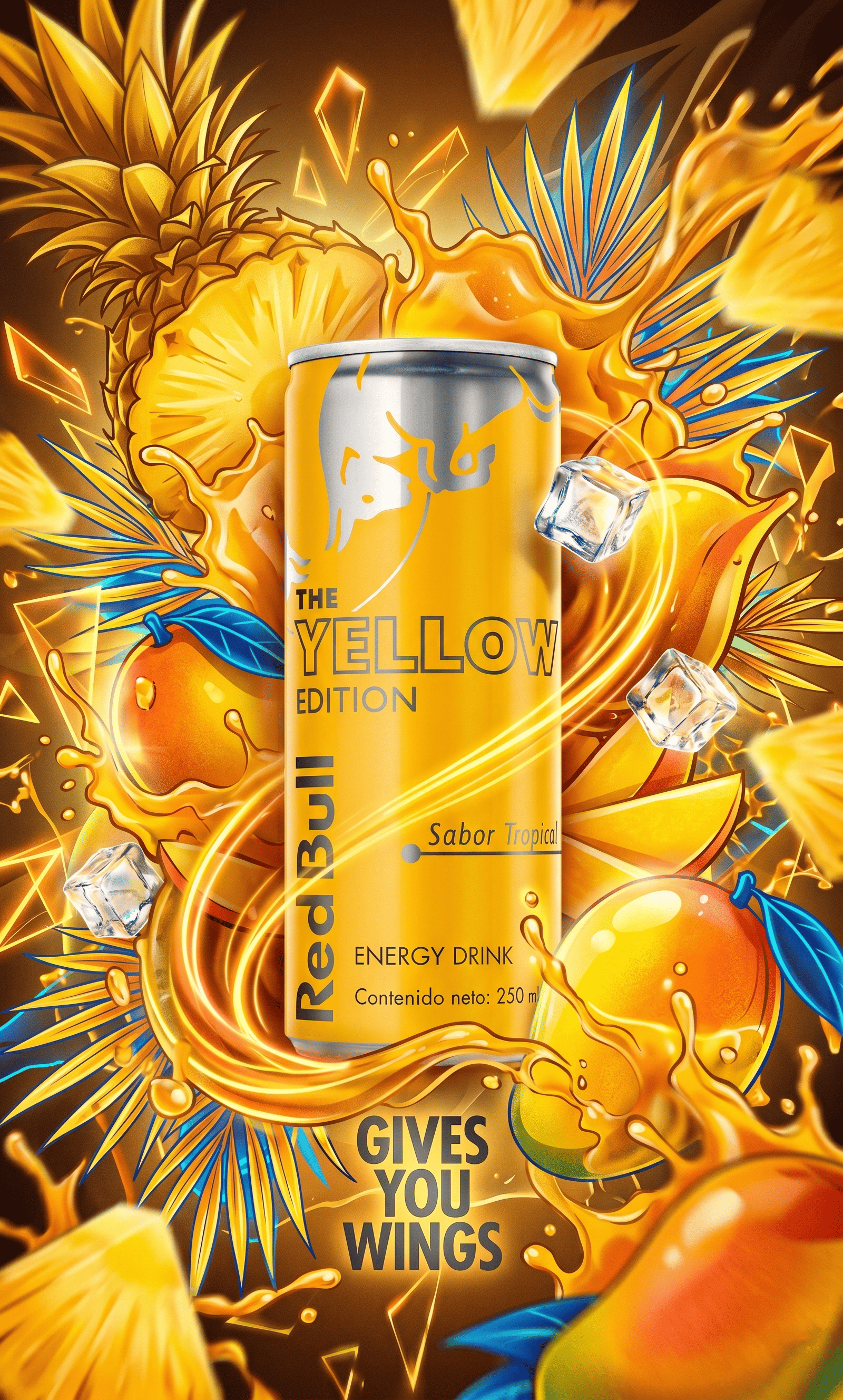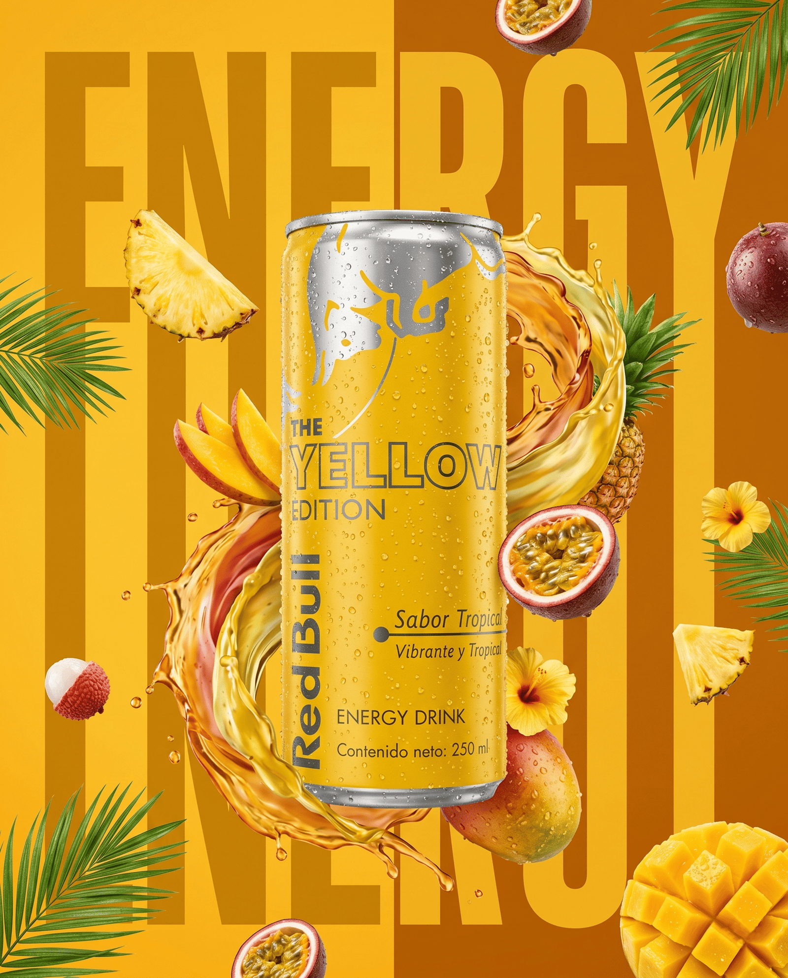 This project explores a vibrant and energetic visual concept for Red Bull Yellow Edition, inspired by tropical flavors and high-impact refreshment. The composition highlights the product in motion, surrounded by dynamic liquid splashes, fresh fruit elements like pineapple and mango, and crystalline accents that enhance the sensation of coldness and vitality. The bright yellow palette reinforces the flavor identity while conveying energy, freshness, and a bold lifestyle appeal aligned with the brand’s adventurous spirit.