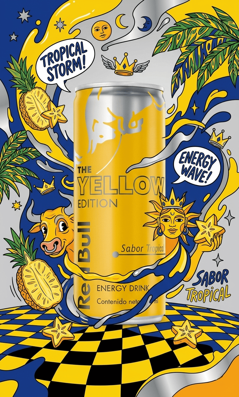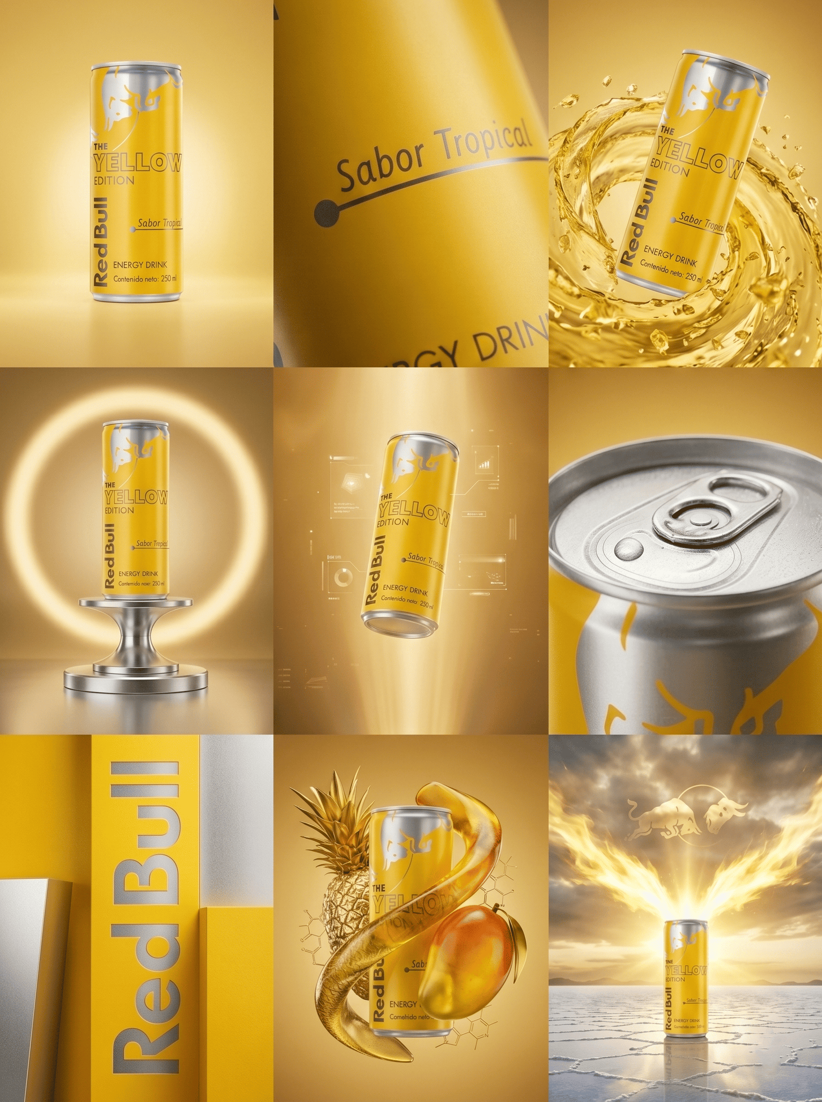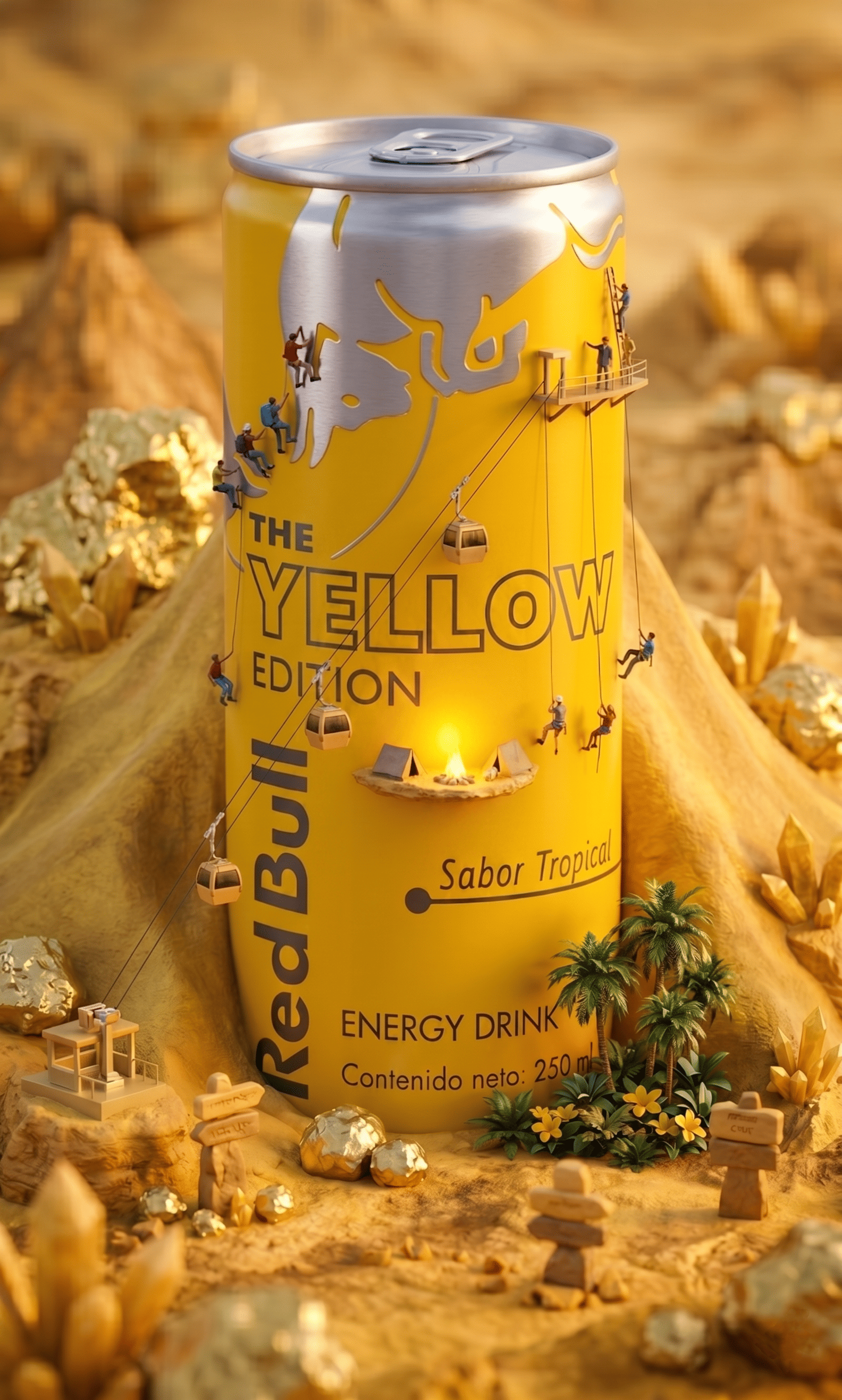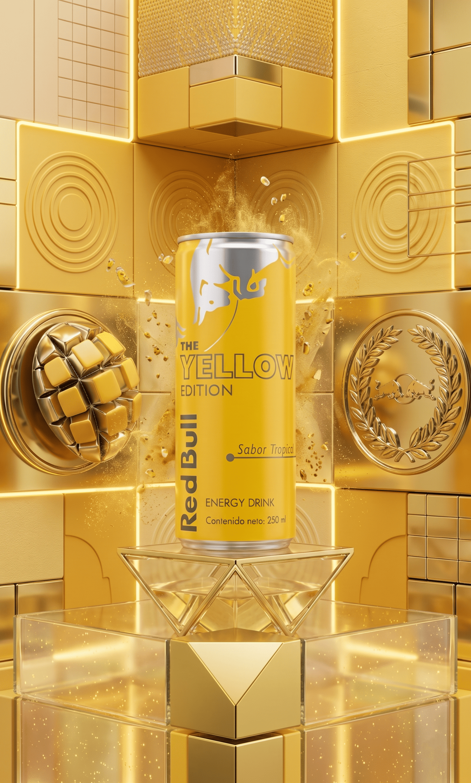 This project explores a vibrant and energetic visual concept for Red Bull Yellow Edition, inspired by tropical flavors and high-impact refreshment. The composition highlights the product in motion, surrounded by dynamic liquid splashes, fresh fruit elements like pineapple and mango, and crystalline accents that enhance the sensation of coldness and vitality. The bright yellow palette reinforces the flavor identity while conveying energy, freshness, and a bold lifestyle appeal aligned with the brand’s adventurous spirit.